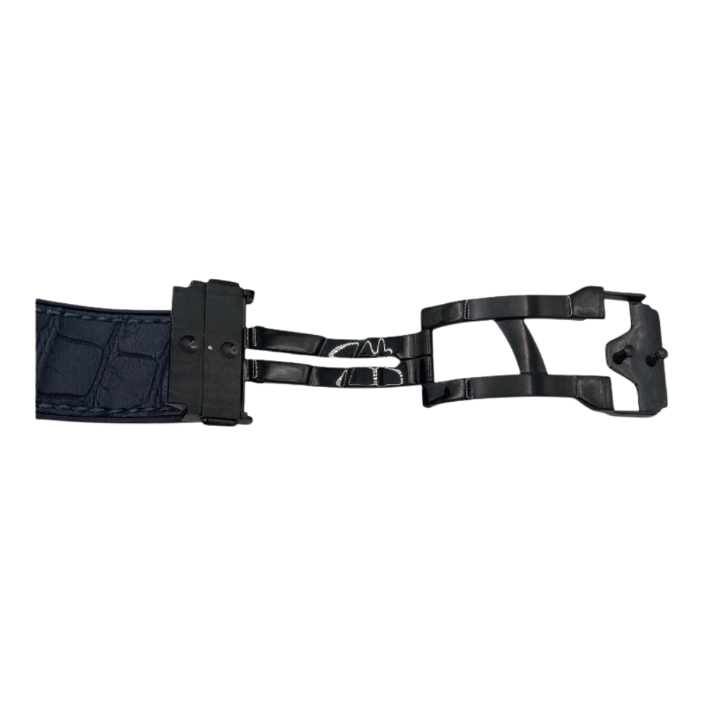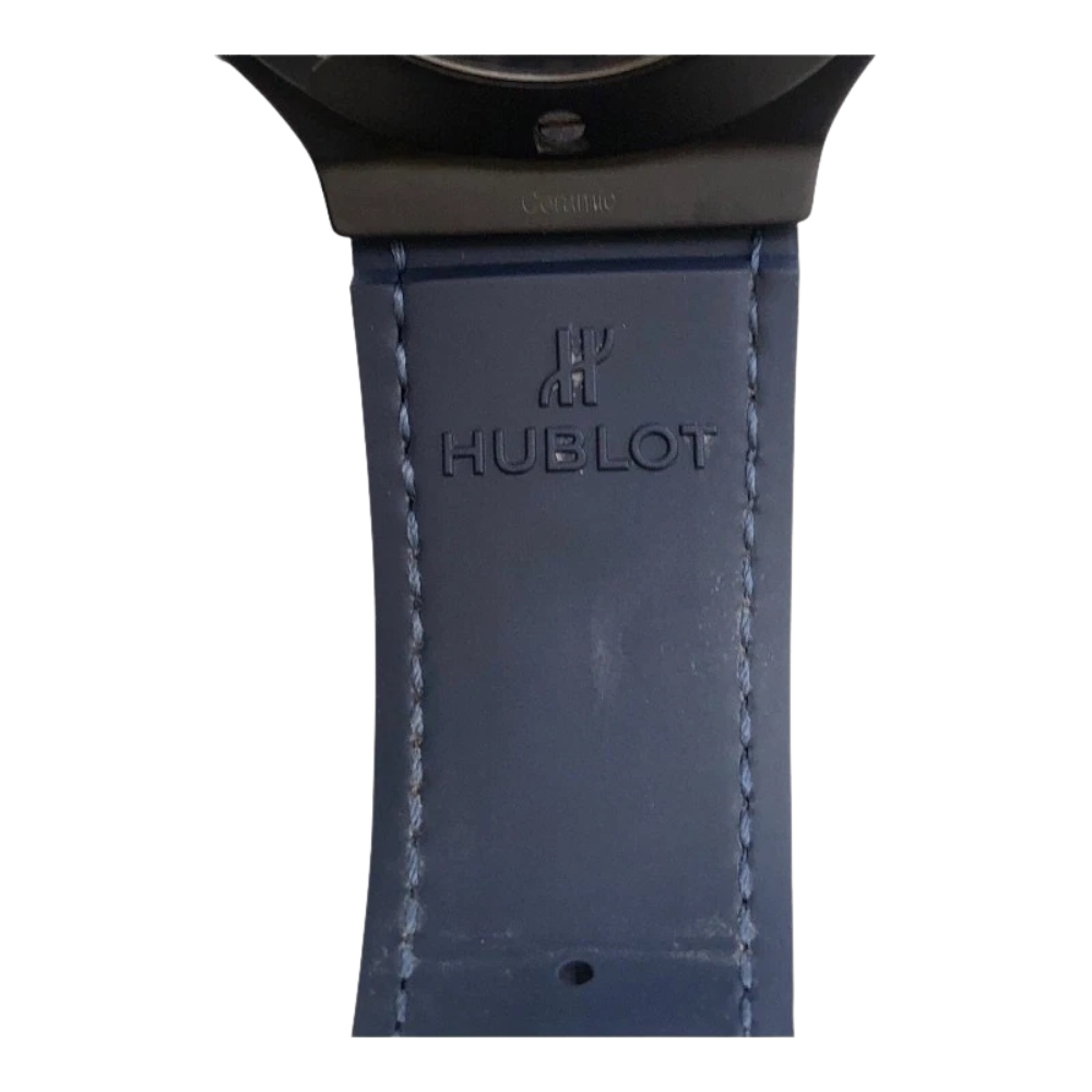 The blue dial features chronograph counters, luminous hands, and indices for excellent readability. The watch is fitted with a durable black structured rubber strap, ensuring both comfort and resilience, while the black ceramic bezel secured with Hublot’s signature H-shaped titanium screws reinforces its bold character.