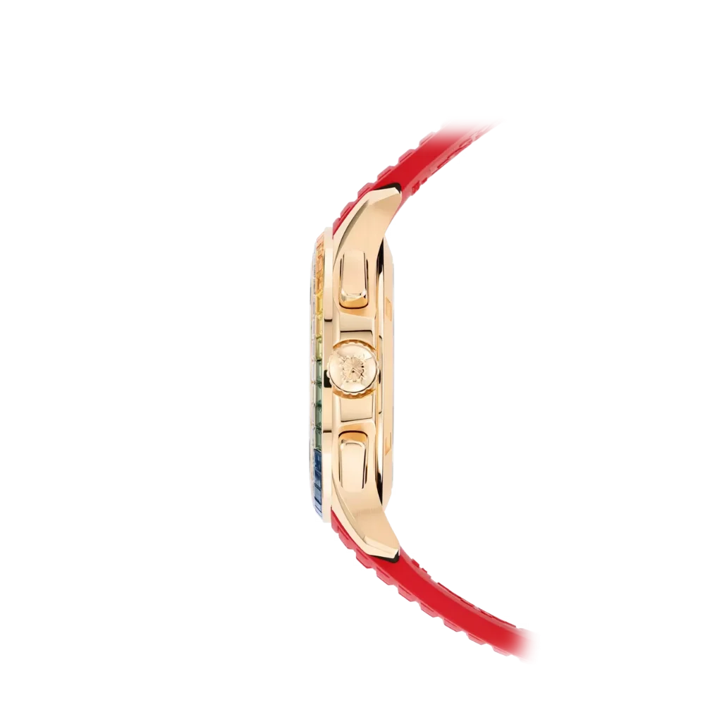 Bezel: Set with multicolored baguette‑cut sapphires and diamonds in a full rainbow gradient