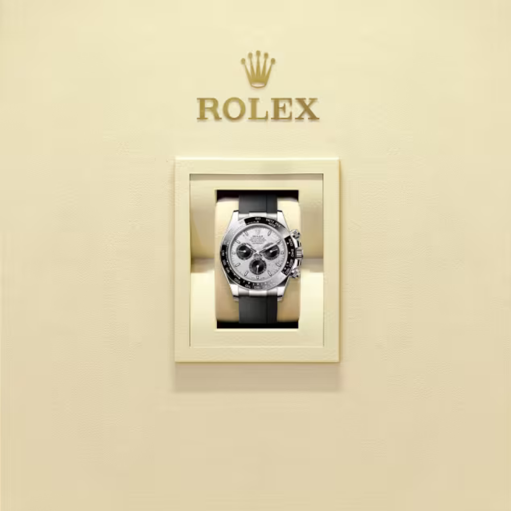The Cosmograph Daytona Ref. 116519LN-0038 combines 18 ct white gold with a black ceramic bezel and a striking meteorite dial — a rare and distinctive variation within the Daytona series. Introduced around 2021, this version features the innovative Oysterflex rubber strap, merging sporty comfort with refined luxury appeal.