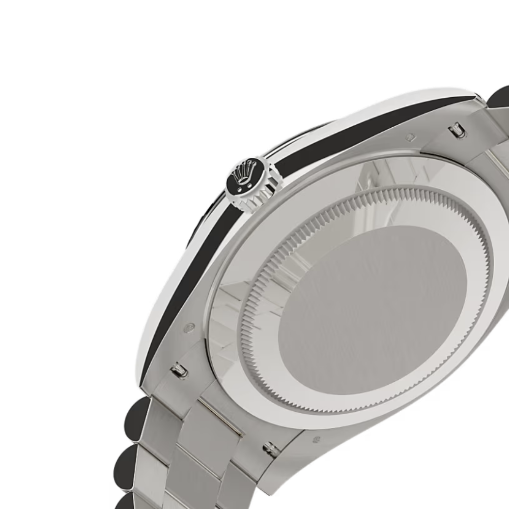 The fluted bezel is a true Rolex signature, originally designed for functional waterproofing. Today, it stands as an unmistakable hallmark of elegance and is meticulously crafted in 18 ct white gold, emphasizing the Day-Date’s exclusivity.
