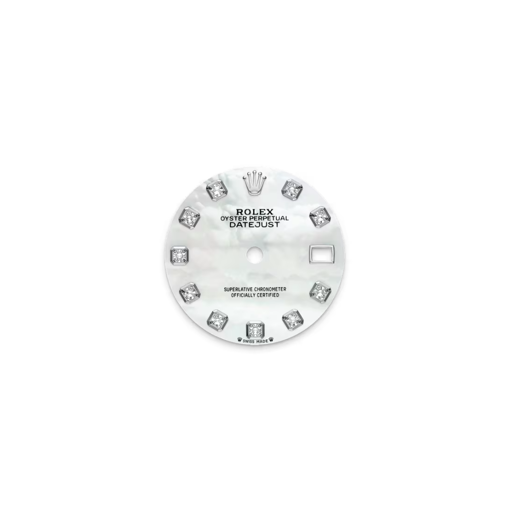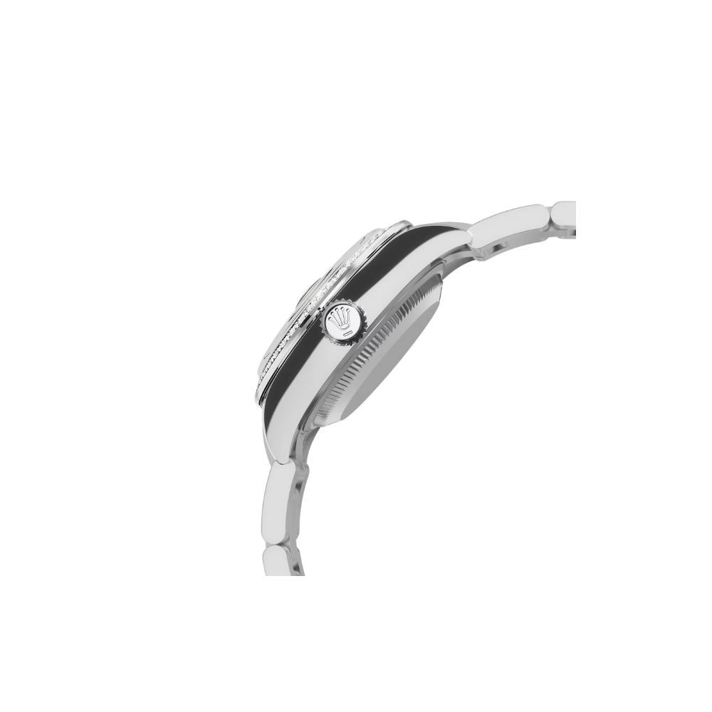 Bezel: Diamond-set bezel in white gold; precision gem-setting by Rolex artisans for sparkle and symmetry