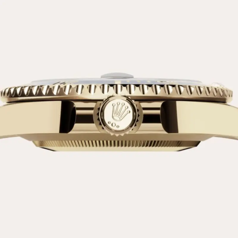 The timepiece is fitted with the iconic Oyster bracelet in solid 18k yellow gold, combining polished center links with satin-brushed outer links. The bracelet is secured with the Oysterlock safety clasp, which prevents accidental opening, and features the Rolex Glidelock extension system for tool-free micro-adjustments—ideal for wearing over a diving suit.