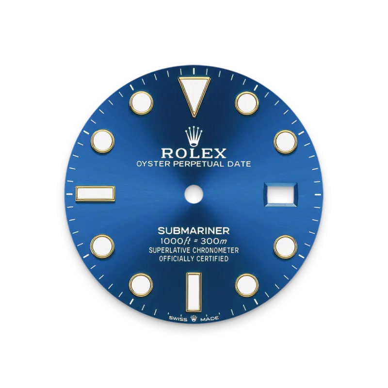 This Submariner Date is crafted from solid 18k yellow gold, giving it a distinctive blend of luxury and durability. The 41 mm Oyster case is finished with a mix of polished and brushed surfaces, enhancing its sporty yet refined character. The unidirectional rotatable bezel features a royal blue Cerachrom insert in ceramic with gold-coated numerals and graduations, designed for precise and reliable dive-time measurement.