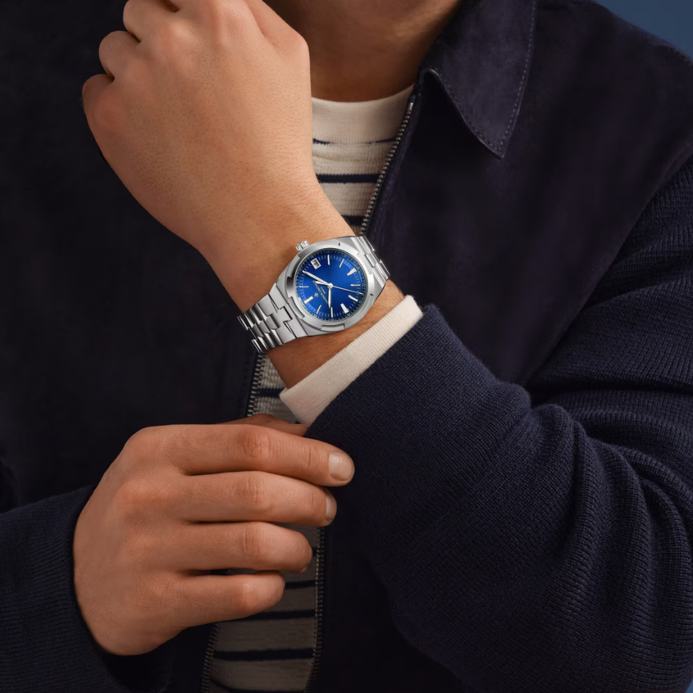 The Overseas offers a practical interchangeable bracelet system, allowing seamless transitions between steel, leather, and rubber straps, all secured by a stainless steel triple folding clasp for optimal comfort.